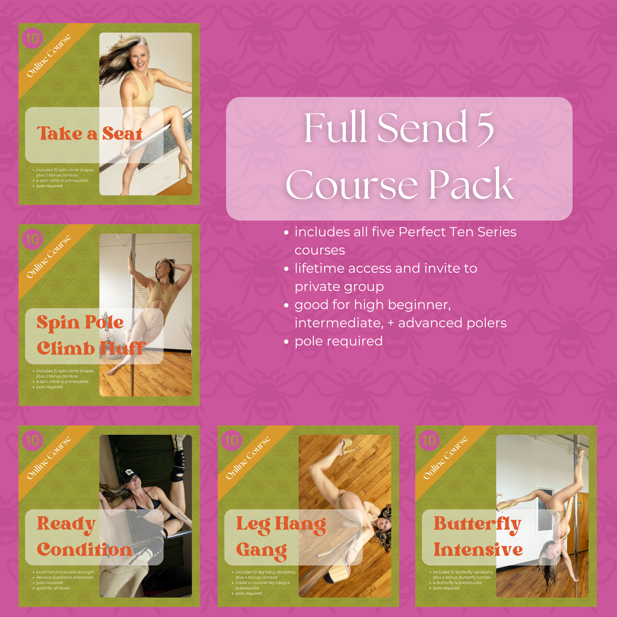 This course pack contains five online courses with content perfect for beginners to intermediate/advanced pole dancers!