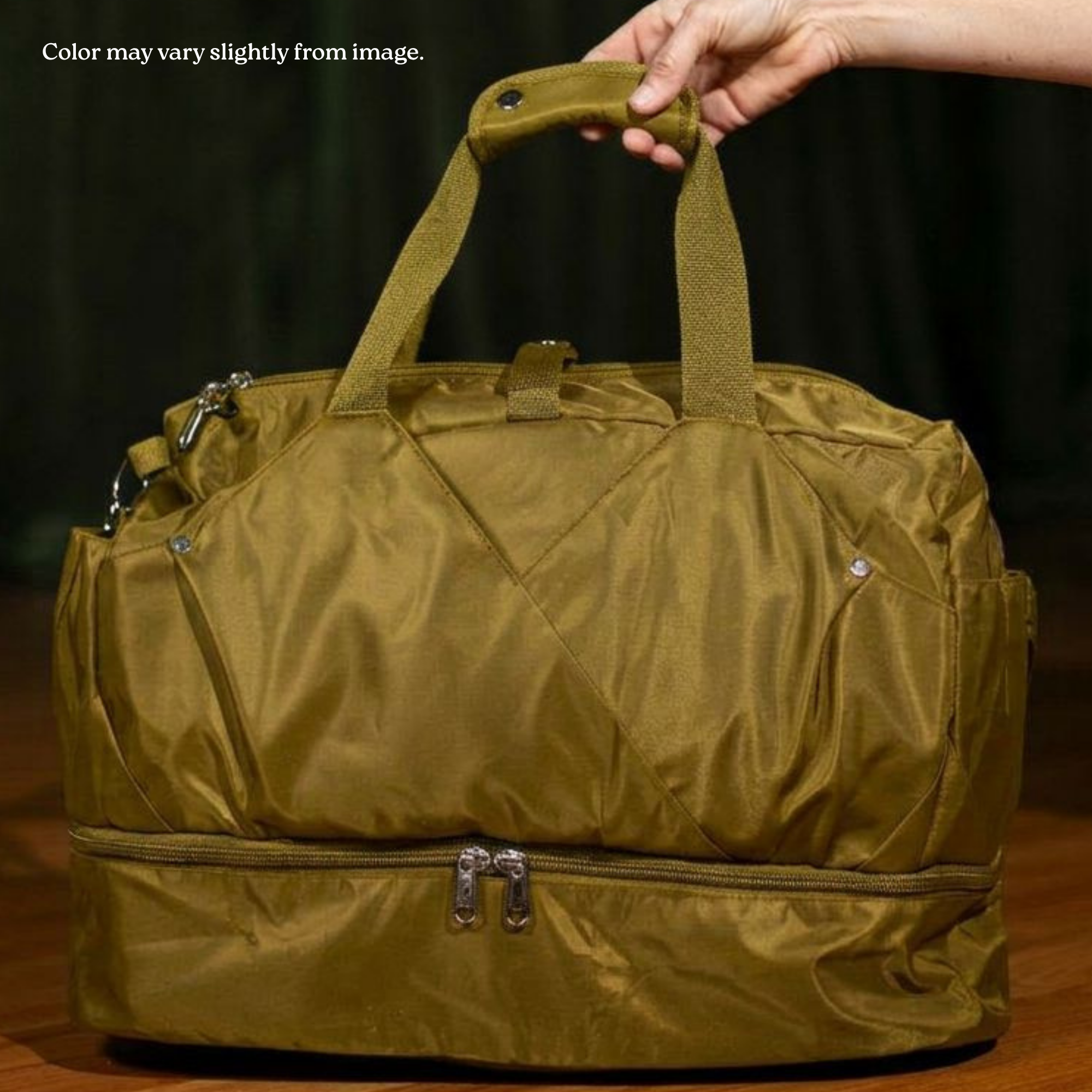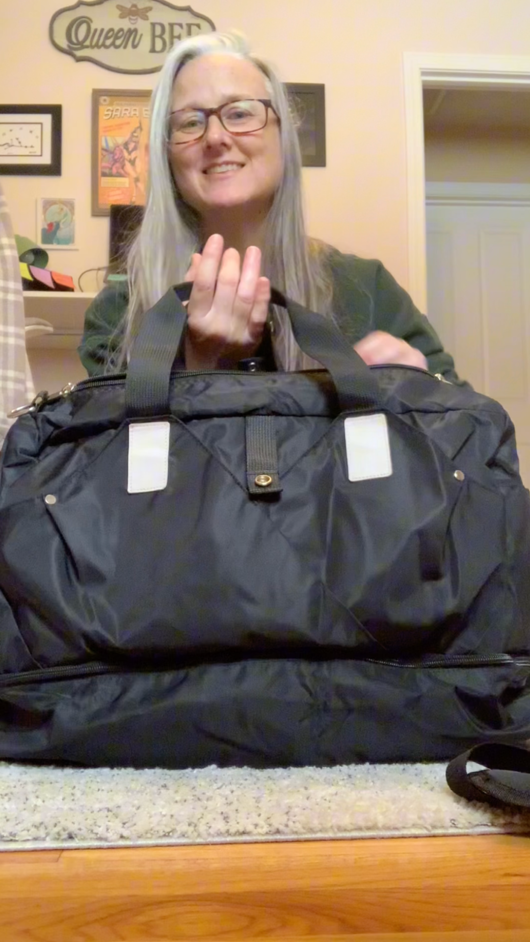 The star is the underneath shoe compartment that accommodates heels and boots. Slip and zip-style pockets everywhere and two bonus bags keep the interior organized.