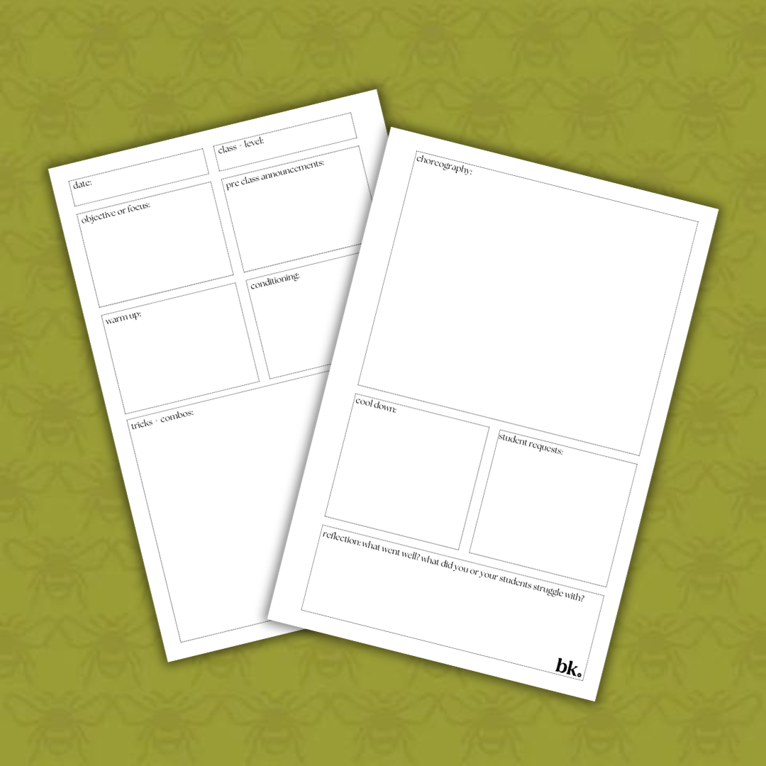 Map out your objectives so you can plan appropriate warm ups and conditioning exercises to support the tricks, combos, and choreography you're teaching. You can jot down student requests as well, which is a major key to keeping students coming back for more week after week.